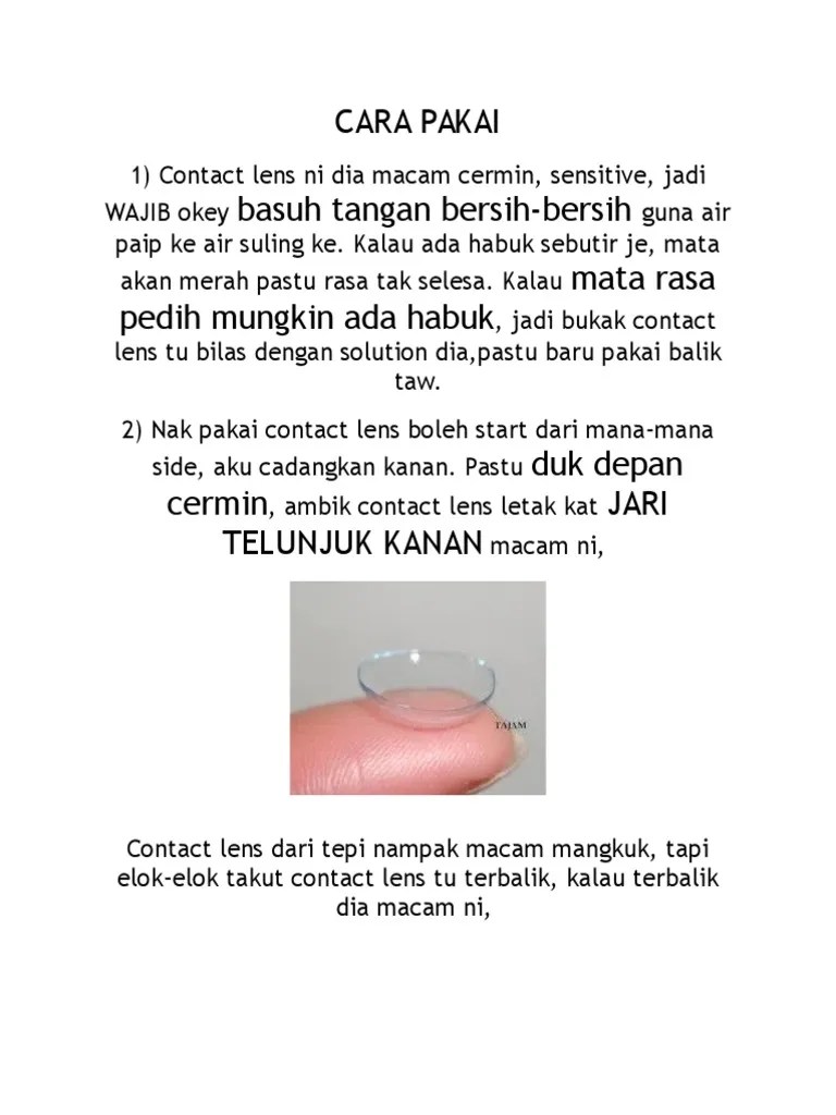 Penyelesaian mudah pakai contact lens atau kanta lekap. Harus di ingat ia penggunaan contact lens bukanlah semudah beli dan pakai. Selepas ini, anda boleh lah memakai kanta lekap dengan cara yang betul dan tidak memudaratkan mata lagi. Tentu anda ada pengalaman sendiri ketika pertama kali mahu menggunakan contact lens. Kanta lekap lembut (soft contact lens). Senang cerita, seiring dengan nama channel ni.mengisahkan . 1,154 views apr 27, 2021 assalamualaikum dan hai.dalam video kali ni huda share cara yang paling mudah pakai lenses untuk pemula.